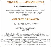 > MARKT DES EHRENAMTES am 20.11.2004 < 26.10.2004 (Für die Berichterstattung über den Markt wählen Sie bitte den Link "Presse") Weiterlesen
