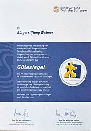 WeiterlesenDie Bürgerstiftung Weimar erhält am 30. September das Gütesiegel für die nächsten 3 Jahre. Unser Vorstandsmitglied Roland Vandreike hat es persönlich...