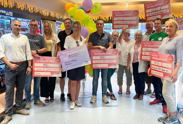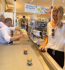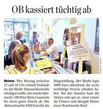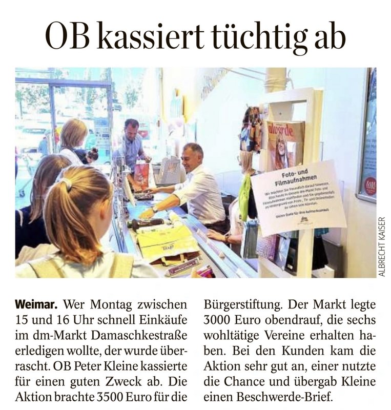 Nicht nur die Projekte der Bürgerstiftung Weimar profitieren von der Jubiläumsaktion des dm Drogeriemarkts in Weimar, bei der Oberbürgermeister Peter Kleine eine Stunde lang die Kasse bediente.