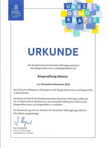 Der Bundesverband der Deutschen Stiftungen verlieh auf seinem StiftungsTag in Mannheim am 5.6. den Deutschen Stifterpreis an die große Familie der deutschen Bürgerstiftungen. Darunter ist auch die Bürgerstiftung Weimar. Prominente Gäste wie Winfried Kretschmann, Ministerpräsident von Baden-Württemberg sowie der Schriftsteller und Kabarettist Eckhard von Hirschhausen würdigen das Engagement der 30.000 ausgezeichneten Bürgerstifterinnen und Bürgerstifter. Mit der höchsten Auszeichnung im Stiftungswesen ehrt der Bundesverband Deutscher Stiftungen in diesem Jahr erstmalig eine so große Gemeinschaft von Stiftenden.