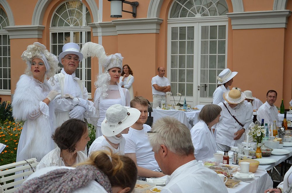 In komplett weißem Outfit, mit geschmackvollen Picknickzutaten, ausgewähltem Besteck, Gläsern und feinem Porzellan treffen wir uns zu einem öffentlichen Picknick - Gemeinschaft pflegen, ungezwungen einen Sommerabend feiern, plaudern und die Stadt Weimar um einen kulturellen Höhepunkt bereichern. Dieses Zeichen französischer Lebenskultur hat inzwischen auch in Weimar Tradition.
