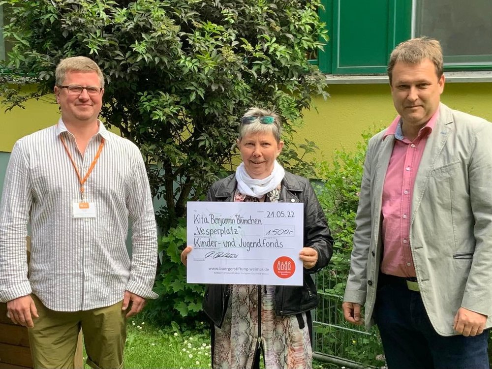 Dank der spendenfreudigen Besucher und der Bürgerstiftung Weimar wurden 3.700 € für das Projekt eingeworben. 1.200 € brachte allein der Erlös aus Kuchenverkauf und den Spenden vor Ort. Jeder dieser Spenden-Euros wurde wiederum vom Kinder- und Jugendfonds der Bürgerstiftung verdoppelt und auf 1500 € aufgerundet. René Röthlich vom Stiftungsrat übergab persönlich den Spendenscheck über die Summe am 21.5.22.