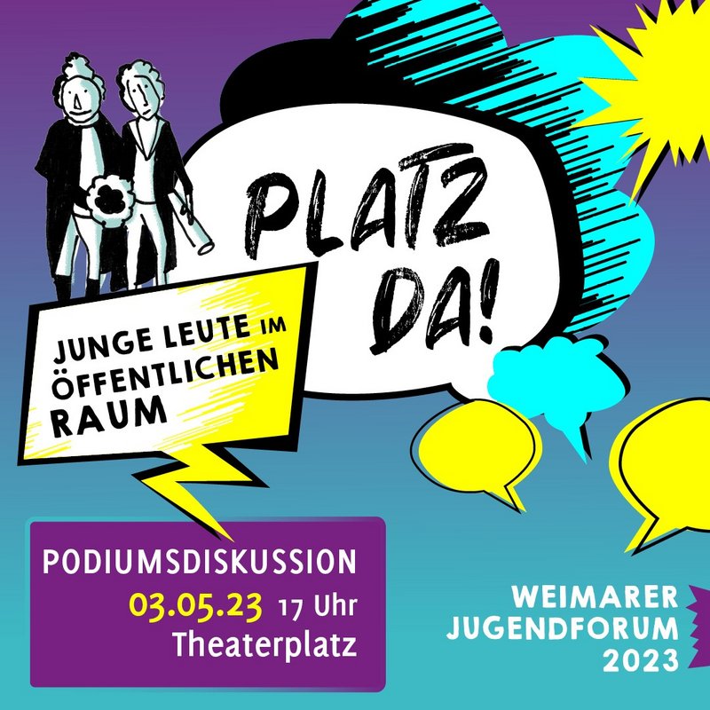 Am 3.5.2023,17 Uhr findet im Rahmen des Jugendforums auf dem Theaterplatz eine öffentliche Podiumsdiskussion zum Thema „Platz da!“ statt.