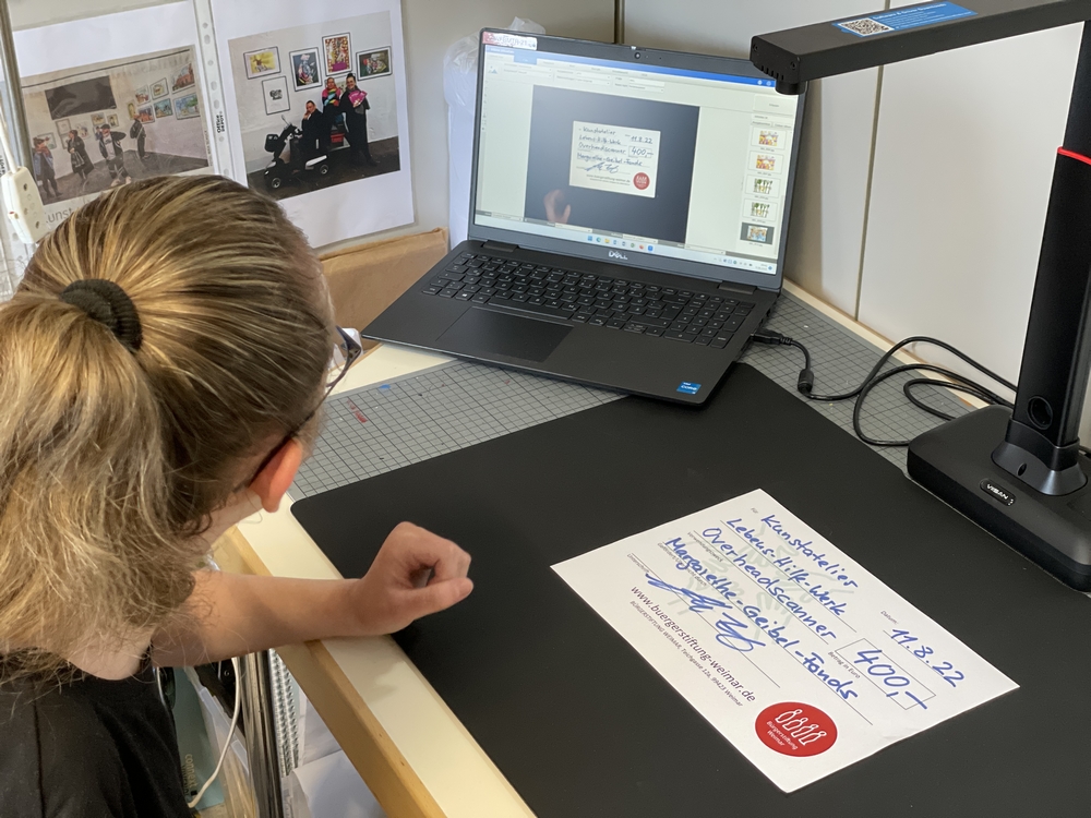 Unsere Mitarbeiterin Stefanie Lachmann hat sich den neuen Overhead-Scanner im Tröbsdorfer Atelier von Leiterin Felicitas Romaniec zeigen lassen. Das Gerät sieht auf den ersten Blick aus wie eine Schreibtischlampe und ist extrem platzsparend. Bis zur Größe von A2 können Werke digital in sehr guter Bildqualität übertragen werden. Auf die Frage, wie Luca das neue Gerät findet? „Geil!“
