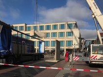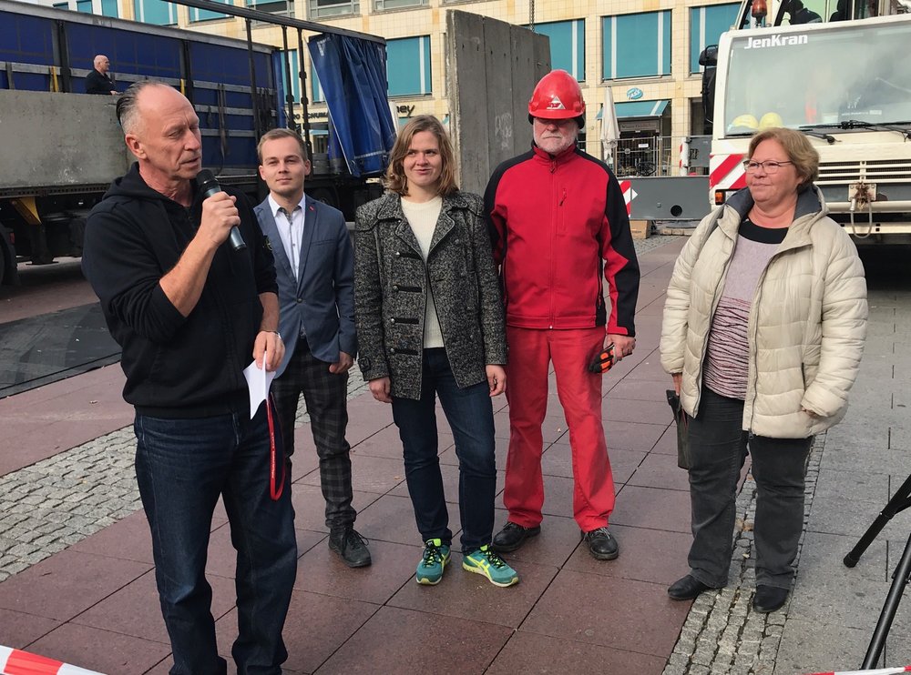Unterstützt von Klaus Deininger und Mitarbeitern der KTW sowie der BB Beton und Bauwaren GmbH, vertreten von Konrad Henke, wurde am 28.10. die temporäre Mauer auf dem Theaterplatz errichtet. 17 Betonsegmente, die von Künstlerin Christina Wildgrube in den kommenden Tagen gestaltet werden. Die einzelnen Teile der Mauerinstallation sind ab sofort für ein Spende ab 500 Euro zu bekommen (Kontakt: Mareike Hage / intendanz[at]nationaltheater-weimar.de). Der Erlös kommt dem Kinder- und Jugendfonds der Bürgerstiftung Weimar zugute. Um den einigenden Gedanken auch über den Zeitraum der Installation hinaus zu verankern, ist die Aufstellung der einzelnen Mauerteile im Weimarer Stadtbild geplant.