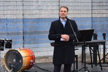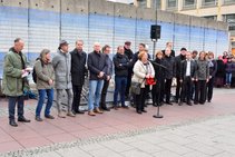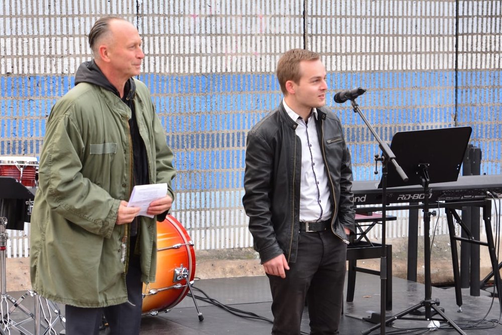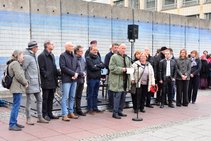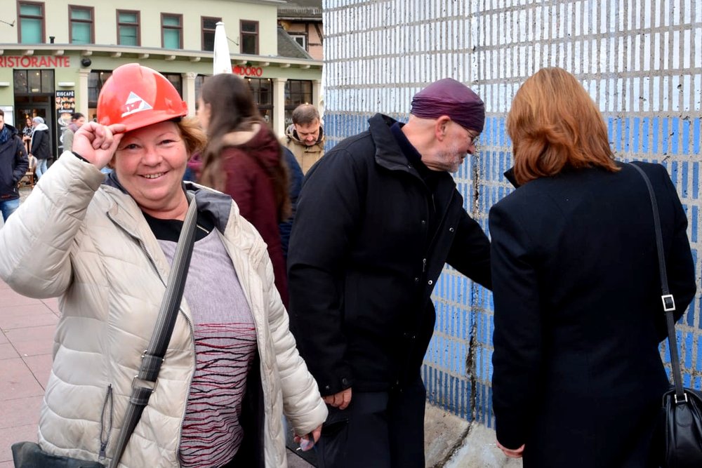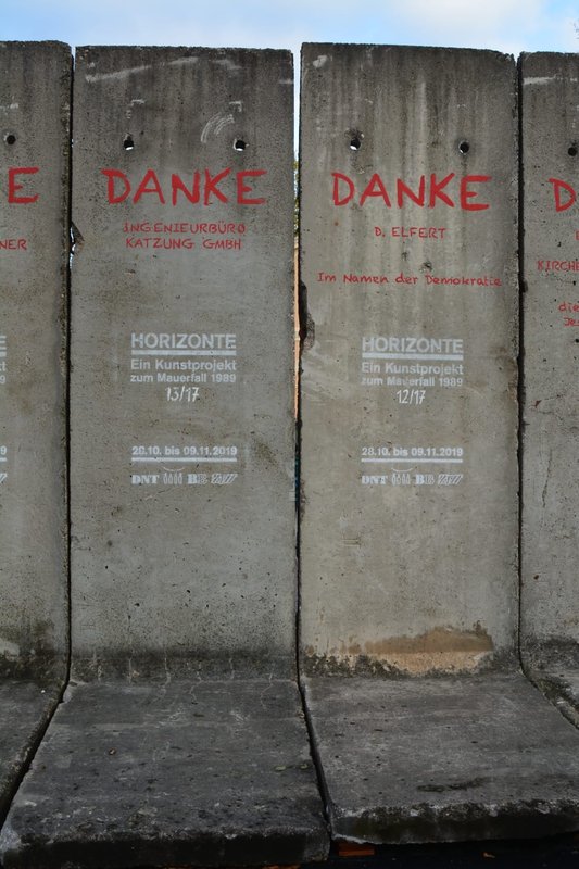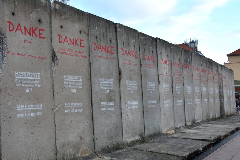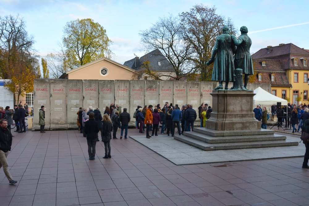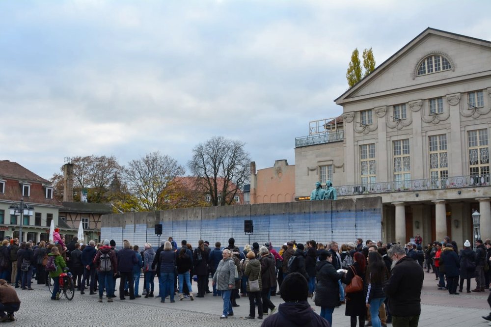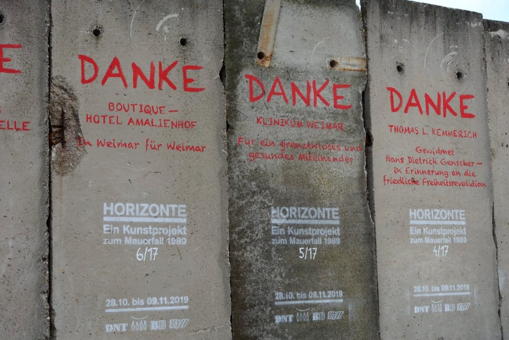 Mit musikalischer Performance und großem Medieninteresse endete am Samstag, dem 9. November, die große Kunstaktion des DNT und der Bürgerstiftung Weimar. Die Mauer, bestehend aus 17 Betonelementen, die Künstlerin Christina Wildgrube seit dem 28.10. unermüdlich in ein Horizontbild verwandelt hatte, wurde symbolisch wieder eingerissen. Die Mauernachbildung, als ein Stück Erinnerungskultur, brachte Weimarer und Gäste zum Nachdenken und Reflektieren des Mauerfalls 30 Jahre zuvor. Die Bauelemente, noch aus DDR-Produktion, wurden von der BB Beton und Bauwaren GmbH in Zeulenroda-Triebes zur Verfügung gestellt. Die KTW- Kunststoff-Technik Weimar und deren Geschäftsführer Klaus Deininger sorgten für Transport und Montage der Elemente und waren mit großem persönlichem Einsatz dabei. Die einzelnen Elemente werden sich an verschiedenen Orten im Stadtbild wiederfinden.
