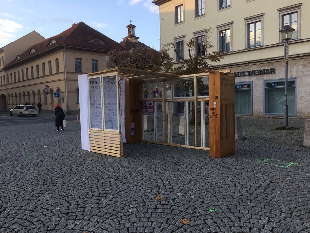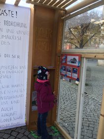 Mit dem Pavillon, der bis Freitag, 15.11. auf dem Goetheplatz stand, informieren die Kinder und Jugendlichen auf Plakaten über die Ziele der jungen Klimaschutzbewegung und luden ein, direkt aktiv zu werden. Vor Ort konnten in einem Schrank ungenutzte Lebensmittel oder Bücher getauscht werden.
