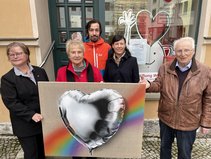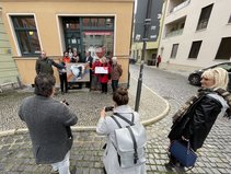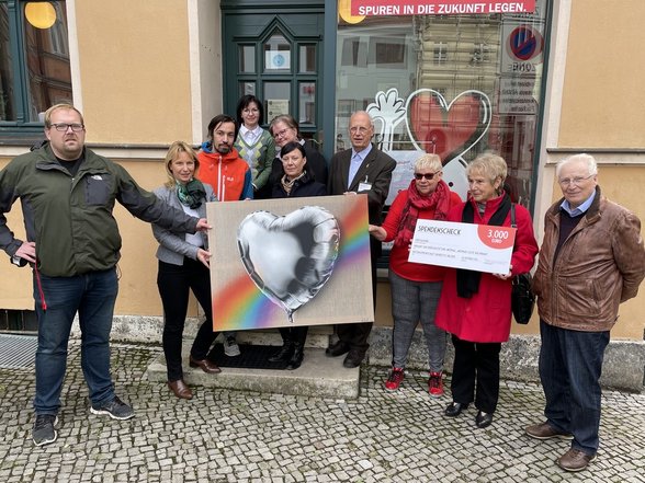 Dass sich so viele Beteiligte der Versteigerung des Graffiti-Kunstwerks zu Gunsten unseres Projekts in die Teichgasse begeben würden, hätten wir nicht erwartet. Fast die gesamte Bietergemeinschaft nebst Künstler Nils Jänisch, Vertretung der Stadtspitze und Presse hatten sich zur Übergabe des symbolischen Schecks eingefunden. Sogar das versteigerte Bild war mit.