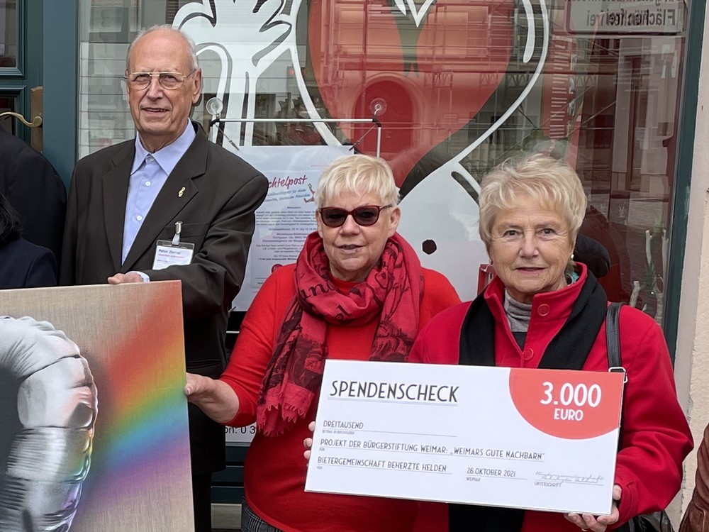 Insgesamt 3000 Euro brachte das am Tag der Deutschen Einheit live gestaltete Graffito des Weimarer Künstlers Nils Jänisch ein. Es war nach der Feierstunde im Schießhaus versteigert worden. Am Dienstag ist der Erlös symbolisch an das Projekt „Weimars Gute Nachbarn“ der Bürgerstiftung Weimar übergeben worden.