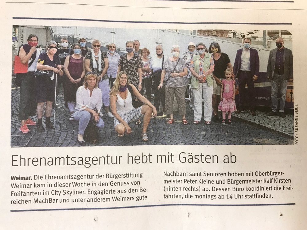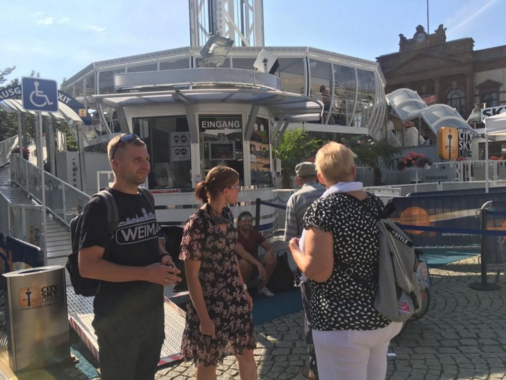 Als Dank für Ehrenamtliche, Senioren und Mitarbeiter der Projekte der Bürgerstiftung Weimar, EhrenamtsAgentur und Weimars Gute Nachbarn, stiegen wir am 14.9. gemeinsam in luftige Höhen und genossen einen unvergleichlichen Blick über unsere Stadt. Wir danken ganz herzlich Bürgermeister Ralf Kirsten für die Ermöglichung der Nutzung des Skyliners.