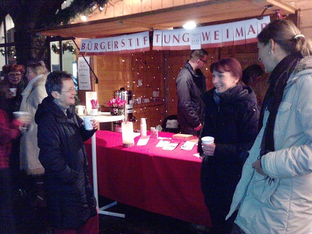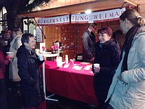 Andrea Wagner und Roland Vandreike (Vorstand) hatten die Hütte für den letzten Tag vor Heiligabend toll dekoriert und alle, die den Stand der Bürgerstiftung betreuten, waren guter Dinge und voller Elan. Trotz des endlosen Regens wurden anfänglich dennoch ein paar Becher der angebotenen edlen Tropfen verkauft. Vor allem der Apfelpunsch nach dem köstlichen Rezept von Eleonore Bleicher ging gut und wurde allseits gelobt.