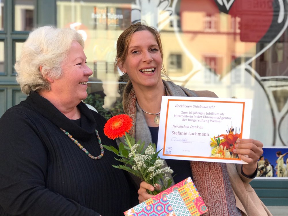 Jahrelang als Mediengestalterin und Sängerin tätig, wünschte sie sich neben der Selbständigkeit wieder mehr Kontakt zu „normalen“ Menschen und einer Arbeit im Team und bewarb sich seinerzeit auf die Stelle der Koordinatorin der EhrenamtsAgentur. Gemeinsam mit Kollegin Wiebke Wagner, die als Sozialpädagogin für die Ehrenamtsberatung zuständig war, leitet sie die Agentur. „Wiebke ist mittlerweile in Niedersachsen, aber einmal im Jahr treffen wir uns zum Wandern auf halber Strecke.“ Mit ihrer derzeitigen Kollegin Anja Pfotenhauer bildet sie seit 2014 ein neues starkes Team. Die beiden sind bekannt für ihre kreativen Ideen und haben dafür auch schon manchen Preis erhalten. Von der Bustour für Engagierte durch Weimar, über eine eigene Radiosendung bis zur MachBar – obwohl beide Frauen nur eine Teilzeitstelle haben, bewirken sie in der knappen Zeit Beachtliches.