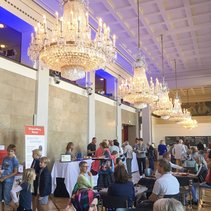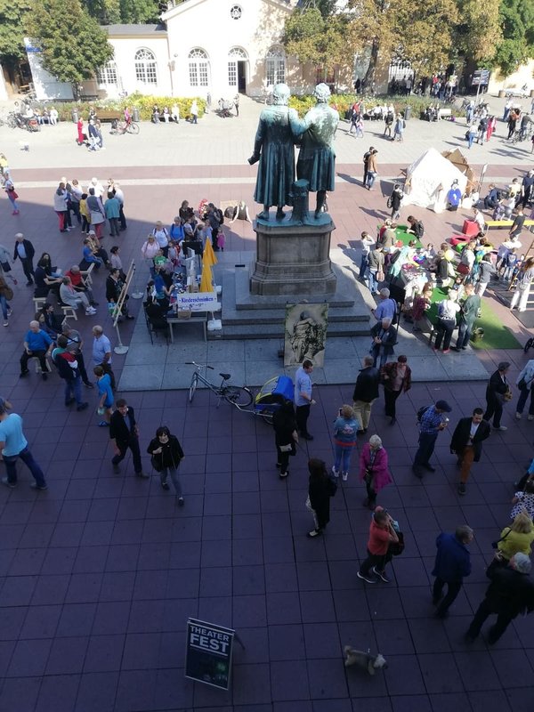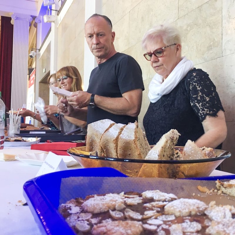Um 15 Uhr war es dann soweit. Das Haus vibrierte vor Leben, Musik, Spiel und Neugier auf das abwechslungsreiche Programm des DNT. Das Theaterfest 2019, zum Auftakt der neuen Spielzeit, war eröffnet. Der Aufruf des Theaters und der Bürgerstiftung Weimar viele Kuchen zu backen, um die über 800 Gäste zu erfreuen, fiel auf fruchtbaren Boden. Die Zufuhr an Blechen und Backformen mit wunderbaren Inhalten nahm schier keine Ende. Auch die Brotklappe und Koriat spendeten leckeres Backwerk. Die fleißigen Kuchenverkäufer hinter der Theke, unter ihnen auch Hasko Weber, Generalintendant, und Doris Elfert, Vorsitzende der Bürgerstiftung, hatten alle Hände voll zu tun.