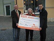 Jens Peters und Björn Sonntag, vom Vorstand des V+ e.V., übergaben den symbolischen Geldbetrag an Vorstandsvorsitzende Doris Elfert. Im Jahr 2013 konnten bereits 18.000 Euro über Spender akquiriert werden.
